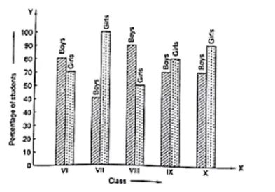 (ii) The lowest failure rate of girls is same to the highest pass rate. Hence, the class having the lowest failure rate of girls is VII (the height of the bar corresponding to girls for this class is maximum).
