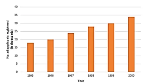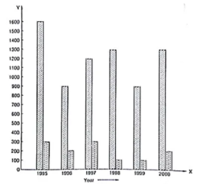 To represent the given data by a vertical bar graph, we first draw horizontal and vertical axes. Let us consider that the horizontal and vertical axes represent the years and the number of applicants registered in thousands respectively. We have to draw 6 bars of different lengths given in the table. At first we mark 6 points in the horizontal axis at equal distances and erect rectangles of the same width at these points. The heights of the rectangles are proportional to the number of applicants registered.