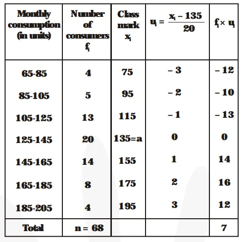 Mean $=\mathrm{a}+\mathrm{h} \times \frac{\mathbf{1}}{\mathbf{n}} \times \Sigma \mathrm{f}_{\mathrm{i}} \mathrm{u}_{\mathrm{i}}=135+20 \times \frac{\mathbf{1}}{\mathbf{6 8}} \times 7$
