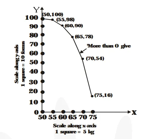 Now, we will draw the ogive by plotting the points (50,100), (55,98), (60,90), (65,78), (70,54) and (75,16). Join these points by a freehand to get an ogive of 'more than' type.