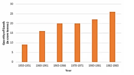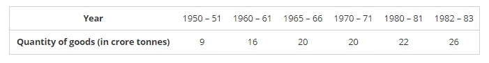 It is seen from the bar graph that the quantity of goods carried in the years 1950 – 51 and 1965 – 66 are 20 Crores tonnes and 9 Crores tonnes. Clearly 20 is more than 2 multiplied by 9. Hence, the statement is true.