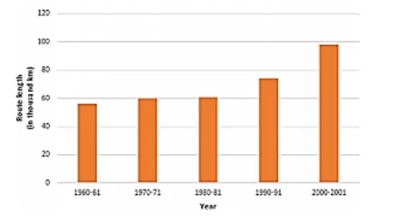 The following table gives the route length (in thousand kilometres) of the Indian Railways in some of the years: