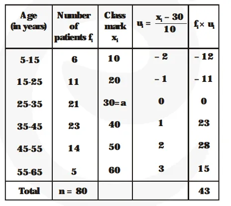 Mean $=\mathrm{a}+\mathrm{h} \times \frac{\mathbf{1}}{\mathbf{n}} \times \Sigma \mathrm{f}_{\mathrm{i}} \mathrm{u}_{\mathrm{i}}=30+10 \times \frac{\mathbf{1}}{\mathbf{8 0}} \times 43$