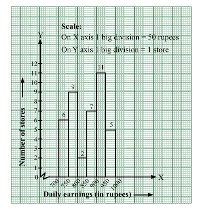 We will represent the class intervals [daily earnings (in rupees)] along the x-axis & the corresponding frequencies [number of stores] along the y-axis.