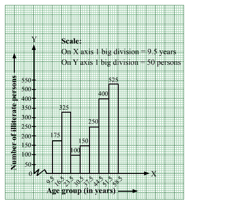 We will construct rectangles with class intervals (age) as bases and the corresponding frequencies (number of illiterate persons) as