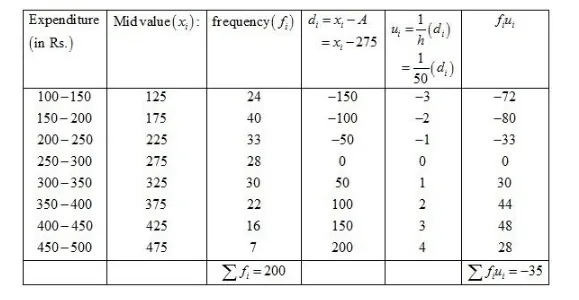Now, we have $N=\sum f_{i}=200, \sum f_{i} u_{i}=-35, h=50$ and $A=275$.
