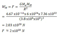 Calculate the weight of the moon from the following data: The universal constant of gravitation $G=6.67 \times 10^{-11} \mathrm{~N}-\mathrm{m}^{2} / \mathrm{kg}$, mass of the moon $=7.36 \times 10^{22} \mathrm{~kg}$, mass of the earth $=6 \times 10^{24} \mathrm{~kg} \mathrm{~ a n d ~ t h e ~ d i s t a n c e ~ b e t w e e n ~ t h e ~ e a r t h ~ a n d ~ t h e ~ m o o n = 3 . 8}$ $\mathrm{km}$.