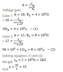 The gain factor of an amplifier is increased from 10 to 12 as the load resistance is changed from $4 \mathrm{k} \Omega$ to $8 \mathrm{k} \Omega$. Calculate (a) the amplification factor and (b) the plate resistance.