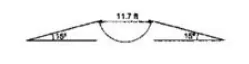 The given figure shows a $11.7 \mathrm{ft}$ wide ditch with the approach roads at tan angle of $15^{\circ}$ with the horizontal. With what minimum speed should a motorbike be moving on the roads so that it safely crosses the ditch?
