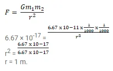The gravitational force acting on a particle of $1 \mathrm{~g}$ due to a similar particle is equal to $6.67 \times 10^{-11} \mathrm{~N}$. Calculate the separation between the particles.