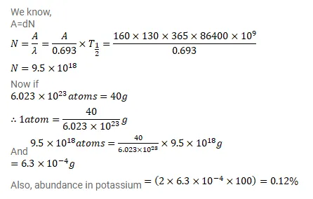 The half-life of ${ }^{40} \mathrm{~K}$ is $1.3 \times 10^{9} \mathrm{y}$. A sample of $1.00 \mathrm{~g}$ of pure $\mathrm{KCL}$ fives $160 \mathrm{counts} / \mathrm{s}$. Calculate the relative abundance of $40 \mathrm{~K}$ (fraction of ${ }^{40} \mathrm{~K}$ present) in natural potassium.