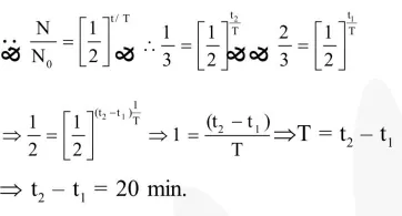 The half life of a radioactive substance is 20 minutes. The approximate time interval $\left(t_{2}-t_{1}\right)$ between the time $t_{2}$ when $\frac{2}{3}$ of it has decayed and time $t_{1}$ when $\frac{1}{3}$ of it had decayed is :-