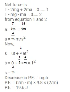 The heavier block in an Atwood machine has a mass twice that of the lighter one. The tension in the string is $16.0 \mathrm{~N}$ when the system is set into motion. Find the decrease in the gravitational potential energy during the first second after the system is released from rest.