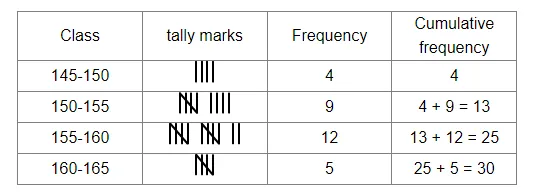 Prepare a frequency table as well as a cumulative frequency table with 160 – 165 (165 not included) as one of the class intervals.