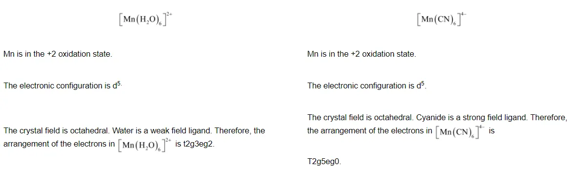 Hence, hexaaquo manganese (II) ion has five unpaired electrons, while hexacyano ion has only one unpaired electron.