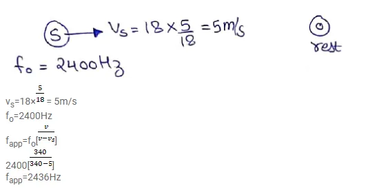 The horn of a car emits sound with a dominant frequency of $2400 \mathrm{~Hz}$. What will be the apparent dominant frequency heard by a person standing on the road in front of the car if the car is approaching at $18.0 \mathrm{~km} \mathrm{~h}^{-1}$ ? Speed of sound in air $=340 \mathrm{~m} \mathrm{~s}^{-}$ 1