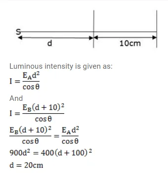 The illuminance of a small area changes from 900 lumen/ $\mathrm{m}^{2}$ to 400 lumen/ $\mathrm{m}^{2}$ when it is shifted along its normal by $10 \mathrm{~cm}$. Assuming that it is illuminated by a point source placed on the normal. Find the distance between the source and the area in the original position.