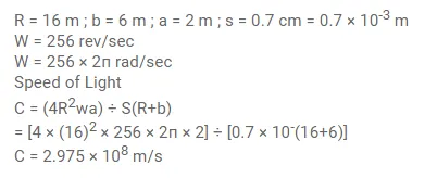 The image is not seen. 2. In an experiment with Foucault's apparatus, the various distances used are as follows: Distance between the rotating and the fixed mirror $=16 \mathrm{~m}$ Distance between the lens and the rotating mirror $=6 \mathrm{~m}$, Distance between the source and the lens $=2 \mathrm{~m}$. When the mirror is rotated at a speed of 356 revolutions per second, the image shifts by $0.7 \mathrm{~mm}$. Calculate the speed of light from these data.