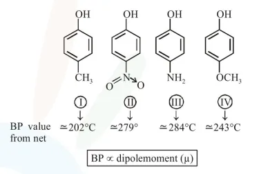 $\Rightarrow$ Shows stronger hydrogen bonding from one side $-\mathrm{OH}-$ group and another side of $-\mathrm{OCH}_{3}$ group shows only dipole-dipole interaction.