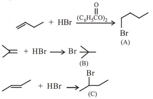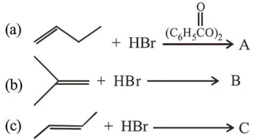 The increasing order of the boiling point of the major products $\mathrm{A}, \mathrm{B}$ and $\mathrm{C}$ of the following reactions will be: