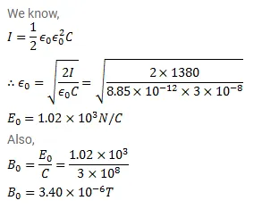The intensity of the sunlight reaching the earth is $1380 \mathrm{~W} / \mathrm{m}^{2}$. Assume this light to be a plane, monochromatic wave, Find the amplitude of electric and magnetic fields in this wave.
