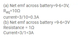 The internal resistance of an accumulator battery of emf $6 \mathrm{~V}$ is $10 \Omega$ when it is fully discharged. As the battery gets charged up, its internal resistance decreases to $1 \Omega$. The battery in its completely discharged state is connected to a charger which maintains a constant potential difference of $9 \mathrm{~V}$. find the current through the battery.