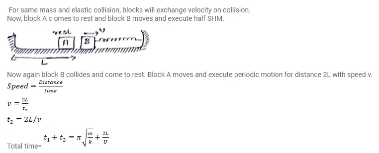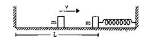 The left in figure moves at a speed v towards the right block placed in equilibrium. All collisions to take place are elastic and the surfaces are frictionless. Show that the motions of the two blocks are periodic. Find the time period of those periodic motions. Neglect the widths of the block.