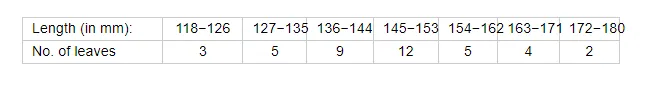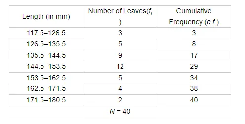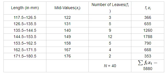 Mean length of the leaf $=\frac{1}{N} \sum f_{i} x_{i}=\frac{1}{40} \times 5880=147$