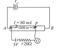 The length of a potentiometer wire is $1200 \mathrm{~cm}$ and it carries a current of $60 \mathrm{~mA}$. For a cell of emf $5 \mathrm{~V}$ and internal resistance of $20 \Omega$, the null point on it is found to be at $1000 \mathrm{~cm}$. The resistance of whole wire is: