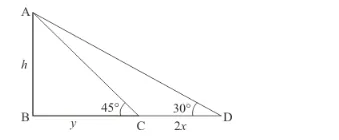 Let AB be the tower of height h m. the length of shadow of tower to be found 2x meters at the plane longer when sun’s altitude is 30° than when it was 45°. Let BC = y m,