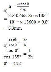 (b) If the length dipped inside is half the answer of part (a), find the angle made by the mercury surface at the end of the capillary with the vertical. Surface tension of mercury $=0.465 \mathrm{~N} / \mathrm{m}$ and the contact angle of mercury with glass $=135^{\circ}$.