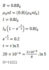 The magnetic field at a point inside a $2.0 \mathrm{mH}$ inductor-coil becomes $0.80$ of its maximum value in $20 \mu$ when the inductor is joined to a battery. Find the resistance of the circuit.