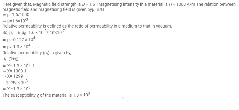 The magnetic field $B$ and the magnetic intensity $\mathrm{H}$ in a material are found to be $1.6 \mathrm{~T}$ and $1000 \mathrm{~A} \mathrm{~m}^{-1}$, respectively. Calculate the relative permeability $\mu_{r}$ and the susceptibility $X$ of the material.
