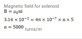 The magnetic field $\mathrm{B}$ inside a long solenoid, carrying a current of $5.00 \mathrm{~A}$, is $3.14 \times 10^{-2} \mathrm{~T}$. Find the number of turns per unit length of the solenoid.