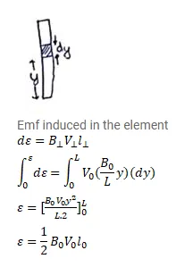 The magnetic field in a region is given by $\vec{B}=\vec{k} \frac{B_{0}}{L} y$ where $\mathrm{L}$ is a fixed length. A conducting rod of length $\mathrm{L}$ lies along the $Y$ axis between the origin and the point $(0, L, 0)$. If the rod moves with a velocity $v=v_{0} \bar{l}$, find the emf induced between the ends of the rod.