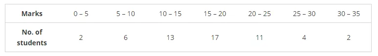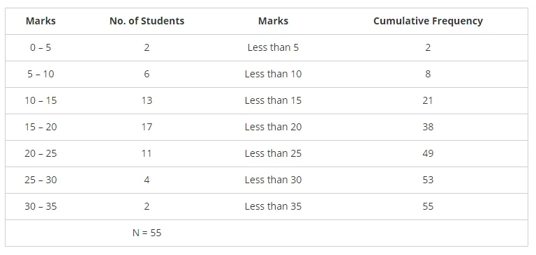 The marks scored by 55 students in a test are given below: