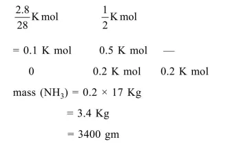 The mass of ammonia in grams produced when $2.8 \mathrm{~kg}$ of dinitrogen quantitatively reacts with $1 \mathrm{~kg}$ of dihydrogen is_____.