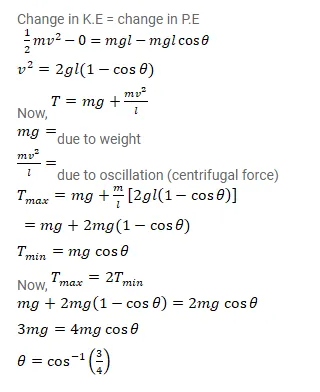 The maximum tension in the spring of an oscillating pendulum is double of the minimum tension. Find the angular amplitude.