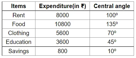 Central angle for each item $=\left(\frac{\text { Expenditure per month on various items }}{\text { Monthly income }} \times 360\right)^{\circ}$