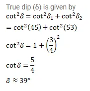 The needle of a dip circle shows an apparent dip of $45^{\circ}$ in a particular position and $53^{\circ}$ when the circle is rotated through $90^{\circ}$. Find the true dip.