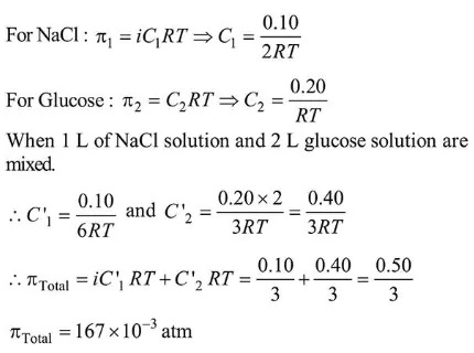 The osmotic pressure of a solution of $\mathrm{NaCl}$ is $0.10 \mathrm{~atm}$ and that of a glucose solution is $0.20$ atm. The osmotic pressure of a solution formed by mixing $1 \mathrm{~L}$ of the sodium chloride solution with $2 \mathrm{~L}$ of the glucose solution is $x \times 10^{-3}$ atm. $x$ is_________________ (nearest integer)