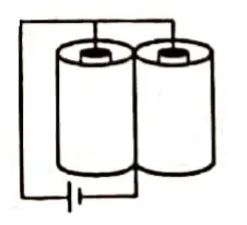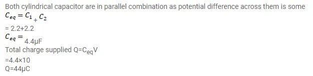 The outer cylinders of two cylindrical capacitors of capacitance $2.2 \mu \mathrm{F}$ each, are kept in contact and the inner cylinders are connected through a wire. A battery of emf $10 \mathrm{~V}$ connected as shown in figure. Find the total charge supplied by the battery to the inner cylinders.