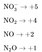 $\mathrm{NO}>\mathrm{NO}_{2}>\mathrm{N}_{2} \mathrm{O}>\mathrm{NO}_{3}^{-}$
