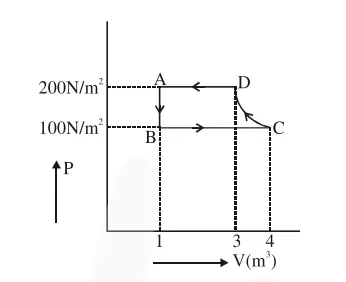 The P-V diagram of a diatomic ideal gas system going under cyclic process as shown in figure. The work done during an adiabatic process CD is (use $\gamma=1.4$ ) :