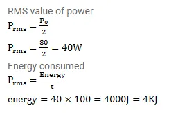 The peak power consumed by a resistive coil when connected to an AC source is $80 \mathrm{~W}$. Find the energy consumed by the coil in 100 seconds which is many times larger than the time period of the source.