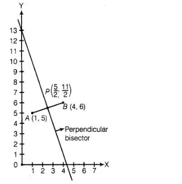 $\therefore \quad$ Mid-point of line segment $=\left(\frac{1+4}{2}, \frac{5+6}{2}\right)=\left(\frac{5}{2}, \frac{11}{2}\right)$