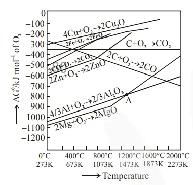At intersection point $\Delta \mathrm{G}=0$ and sudden increase in slope is due to melting or boiling point of the metal.