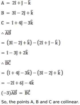 The position vectors of the points $\mathrm{A}, \mathrm{B}$ and $\mathrm{C}$ are $(2 \hat{\mathrm{i}}+\hat{\mathrm{j}}-\hat{\mathrm{k}}),(3 \hat{\mathrm{i}}-2 \hat{\mathrm{j}}+\hat{\mathrm{k}})$ and $(\hat{\mathrm{i}}+4 \hat{\mathrm{j}}-3 \hat{\mathrm{k}})$ respectively. Show that the points A, B and C are collinear.