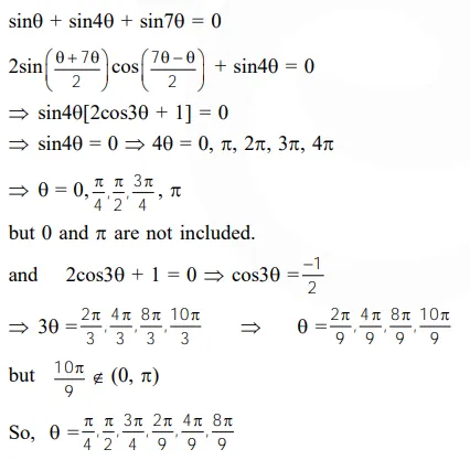 Question: The possible values of $\theta \in(0, \pi)$ such that $\sin (\theta)+\sin (4 \theta)+\sin (7 \theta)=0$ are: