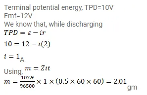 The potential difference across the terminals of a battery of emf $12 \mathrm{~V}$ and internal resistance $2 \Omega$ drops to $10 \mathrm{~V}$ when it is connected to a silver voltameter. Find the silver deposited at the cathode in half an hour. Atomic weight of silver is $107.9$ $\mathrm{g} /$ mole.